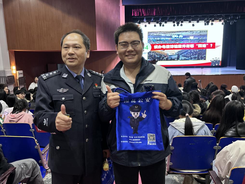 为检验学习成效,讲座特别设置了“反诈知识有奖竞答”环节。刘杰围绕讲座的内容现场提问,同学们踊跃举手抢答,将现场气氛推向高潮。刘警官的讲座深入人心,讲座结束后,多名同学主动与他合影留念。