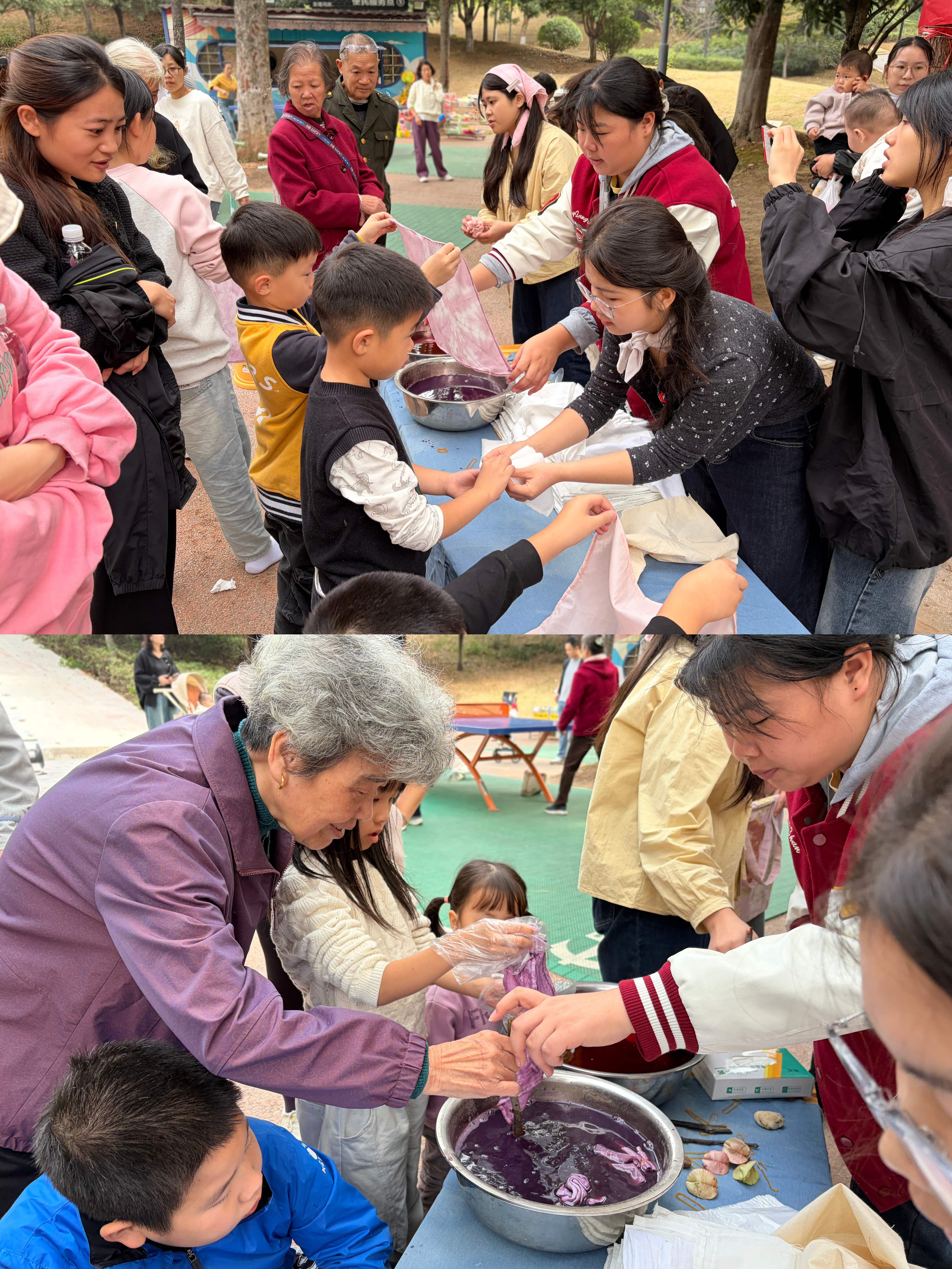 随后,活动的重头戏——天然染色环节在沙滩公园广场上火热开启。志愿者们架起锅具,将处理后的落叶蒸煮,提炼出粉紫、棕褐等色的天然染液。居民在我校师生指导下,学习使用明矾等环保媒染剂对白布进行预处理,并通过浸染、捆扎等工艺,将素白布品浸入自然色彩之中。当一幅幅纹样独特、散发草木清香的染布在阳光下展开时,现场赞叹与欢笑不绝于耳。