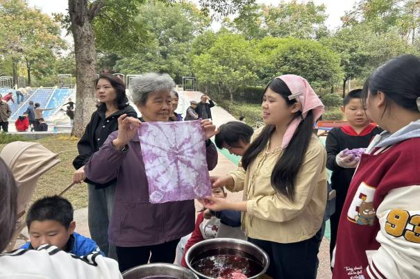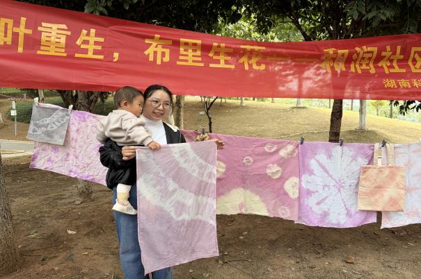 此次活动不仅是一次环保科普行动,更是一堂沉浸式的“劳动+美育”融合课程。社区居民不分老幼,皆沉浸于动手创造的乐趣中。孩子们在游戏中理解了资源循环的意义,长者重温了传统手工艺的智慧,年轻家庭则收获了亲子协作的乐趣。居民李女士展示着自己染制的粉色方巾,欣喜地表示:“这块布独一无二,我打算把它做成围巾,每次佩戴都会想起这个有意义的下午和它所代表的环保理念。”